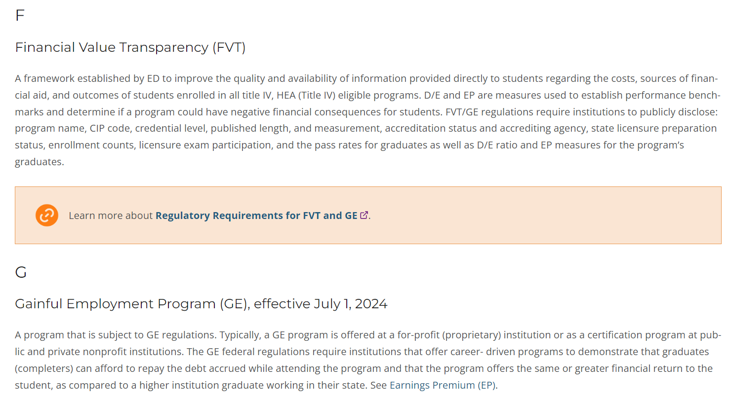 There’s a lot to learn about the new Financial Value Transparency and Gainful Employment (FVT/GE) reporting requirements, including new terminology. That’s why the Clearinghouse created our FVT/GE glossary. It covers the most common terms related to FVT/GE and the reporting process.
